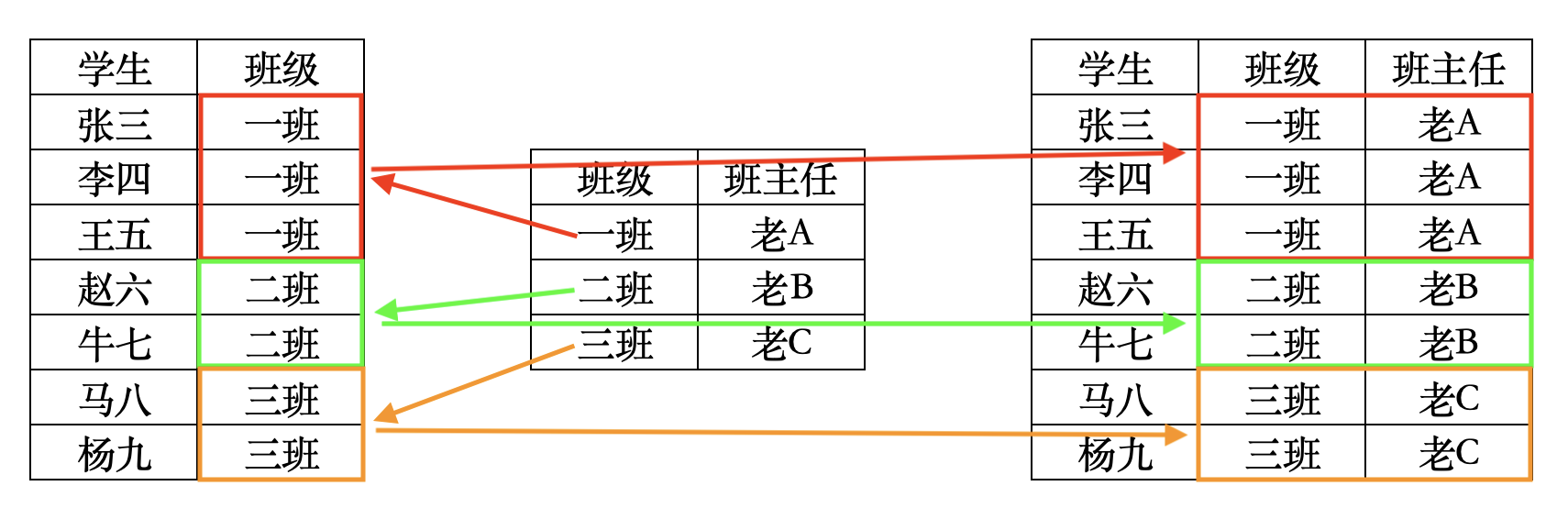 - 上图中,我们有两个表,一个表中包含的列是姓名和班级,另一个表中包含的列是班级和班主任