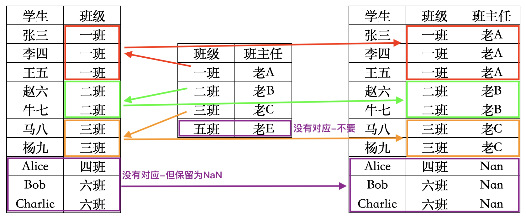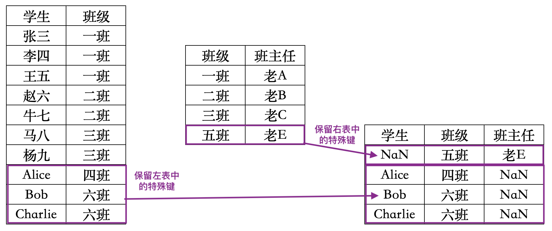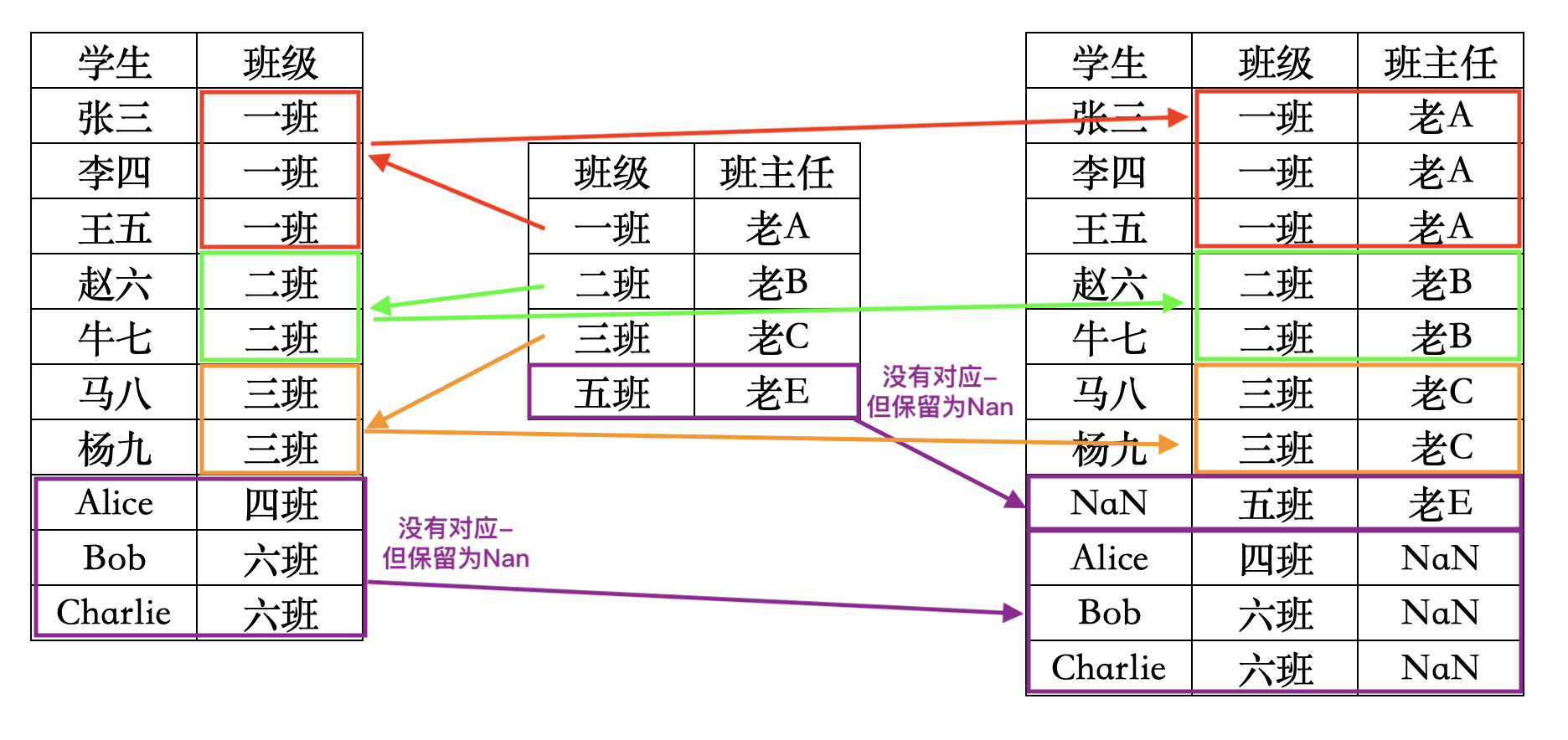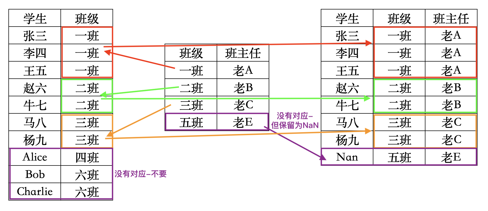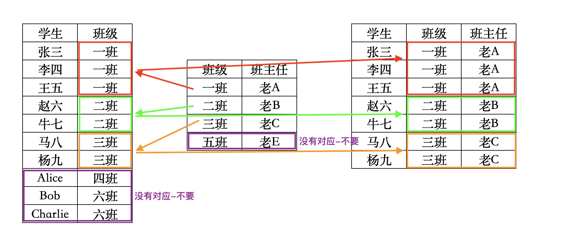 Alice、Bob和Charlie三行的班级分别是四班、四班和六班,在右表中没有对应的班级,所以这三行被丢弃了 - 右表中,