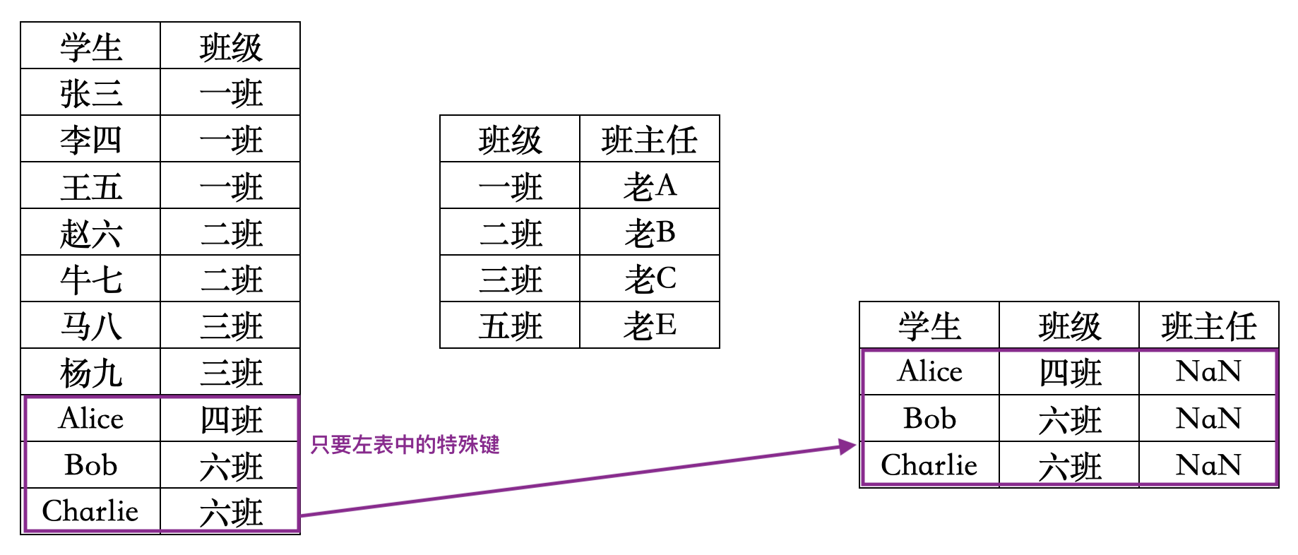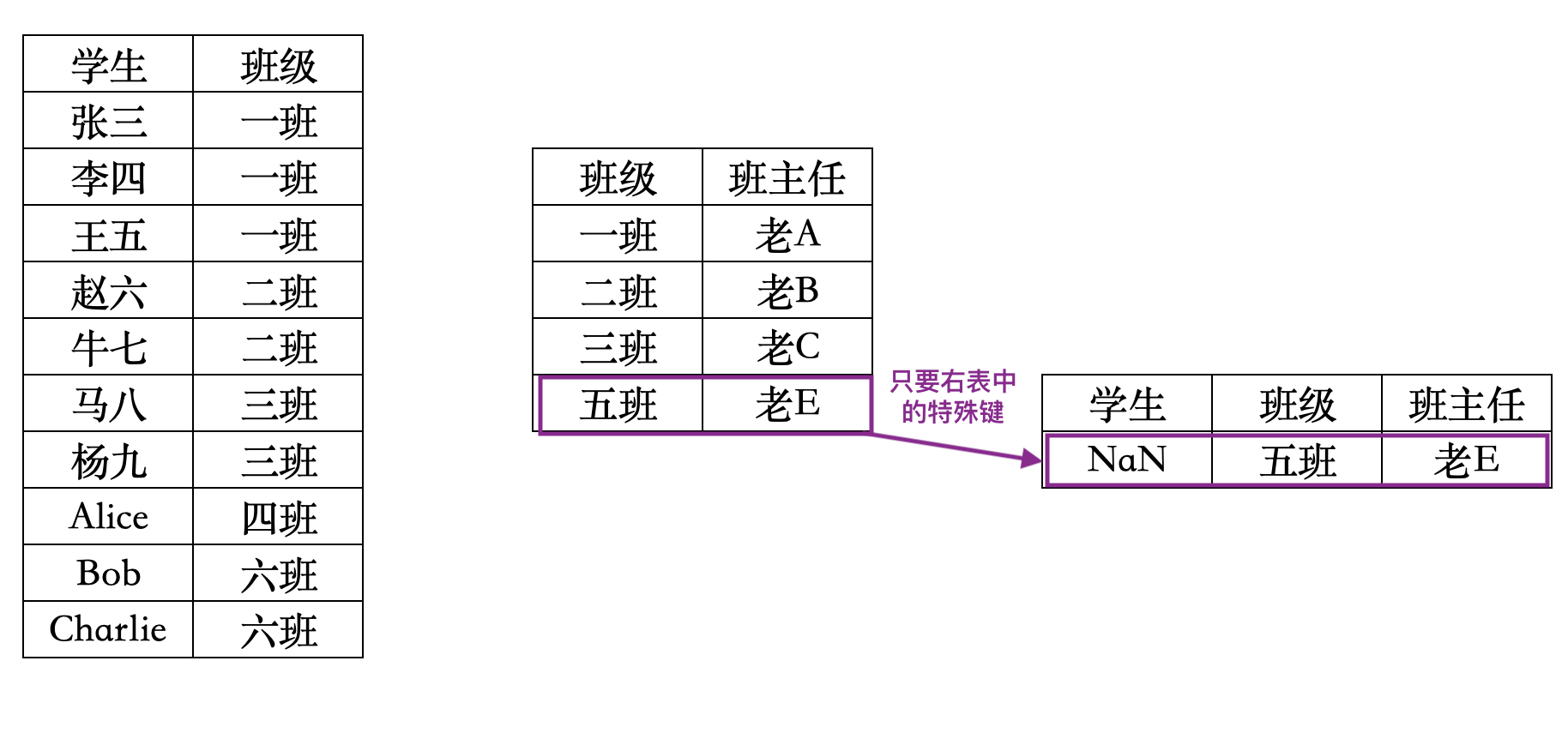 五班的班主任老E,在左表中没有对应的班级,所以这一行也被丢弃了