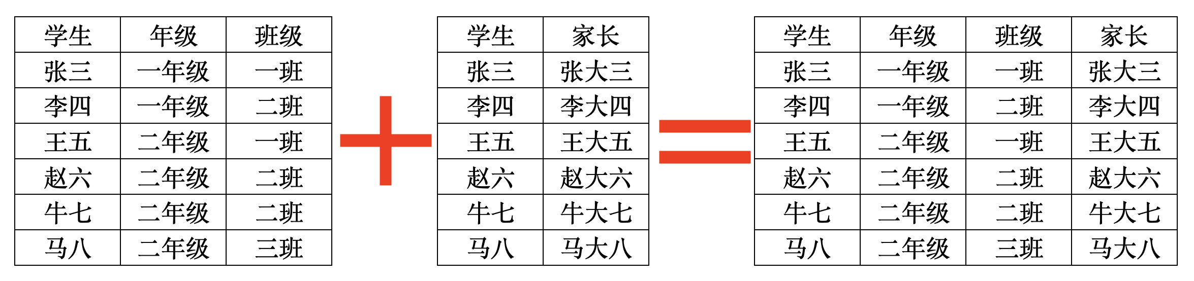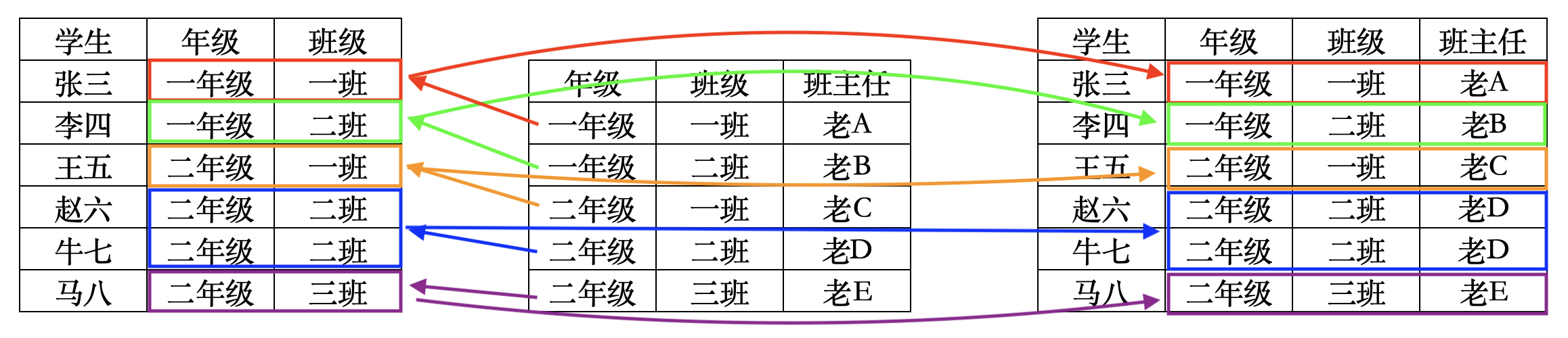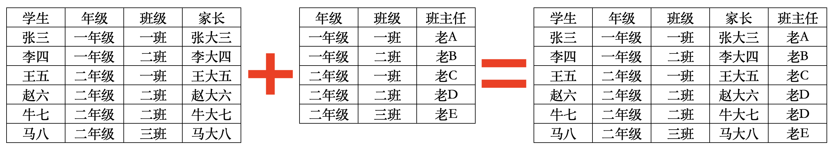 班级这个公共列,将两个表连接在一起,得到一个新的表,这个新表中包含了姓名、班级和班主任三列